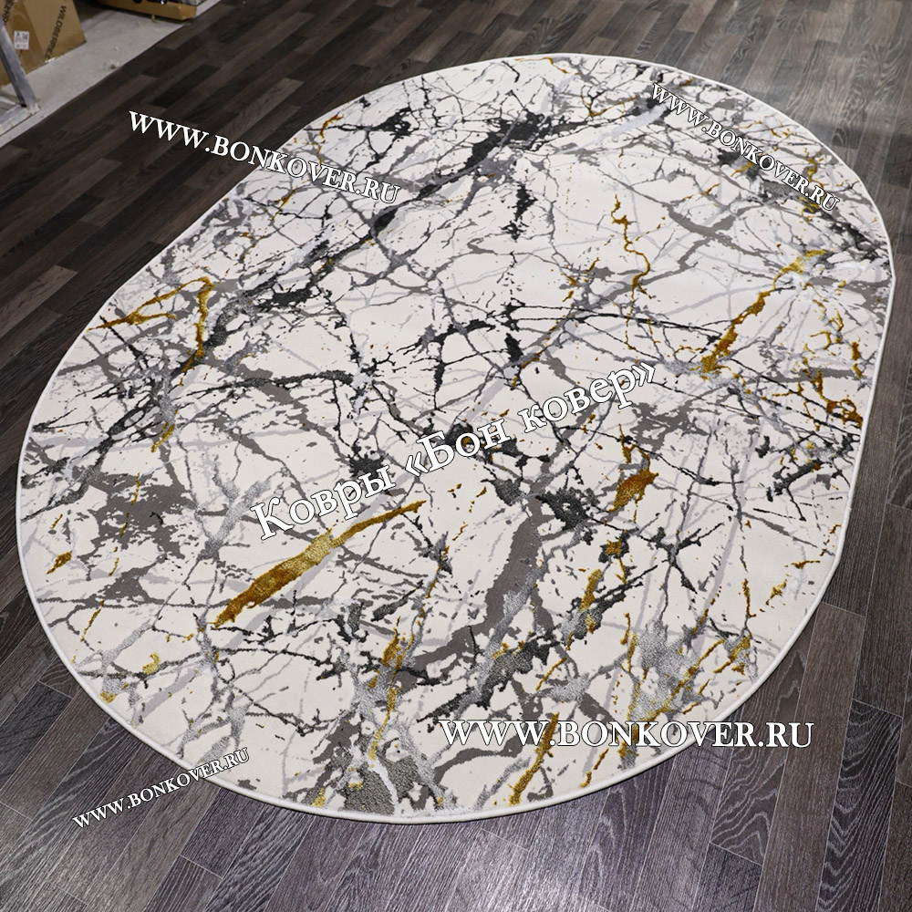 Импозантный Турецкий Овальный Ковер Белый с Золотистым дизайн 05 наполняет интерьер жилого пространства теплом и уютом, гармонично сочетает в себе изящество и красоту. Он соткан из современных материалов, комфортный и долговечный.